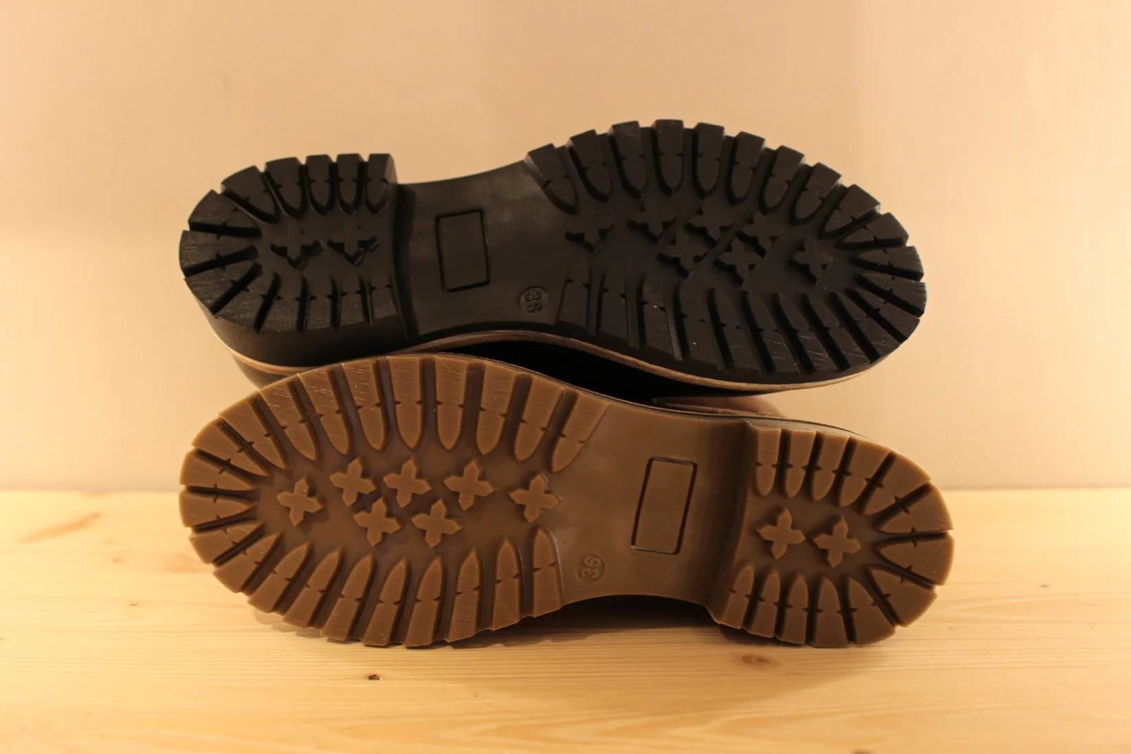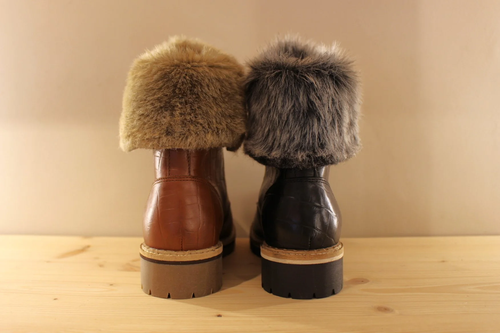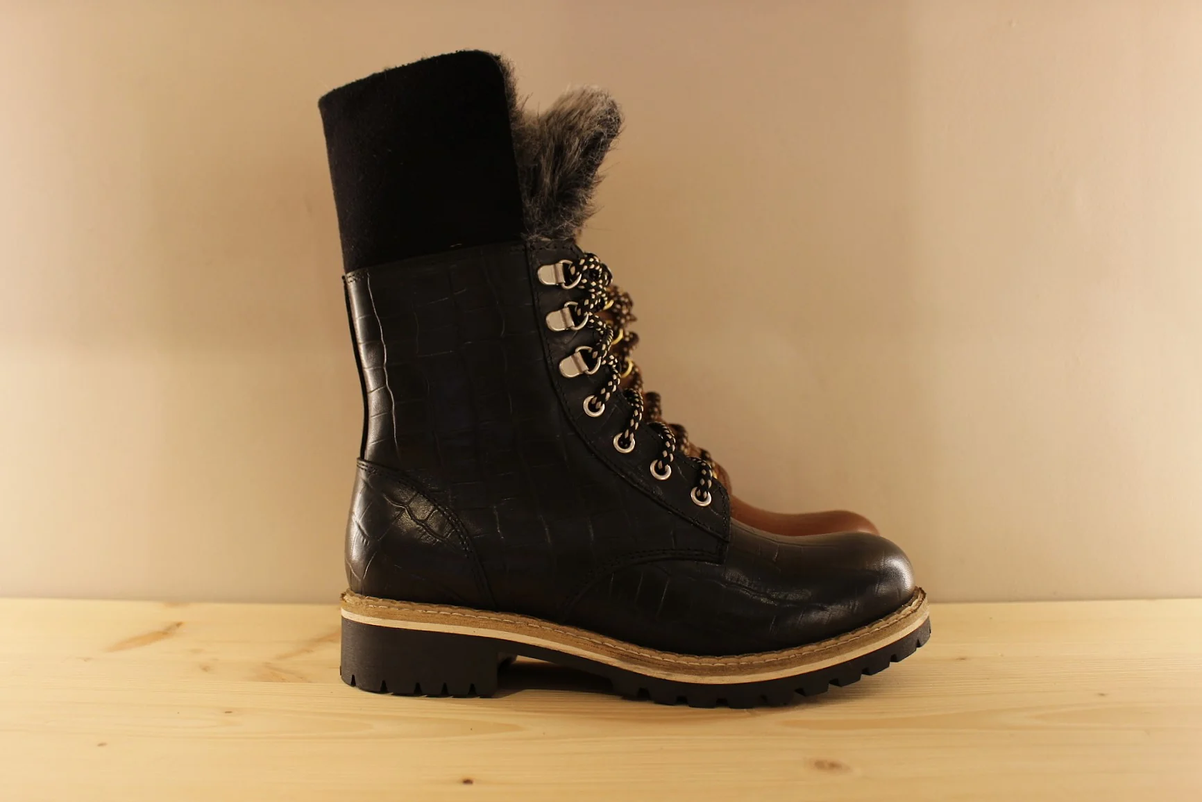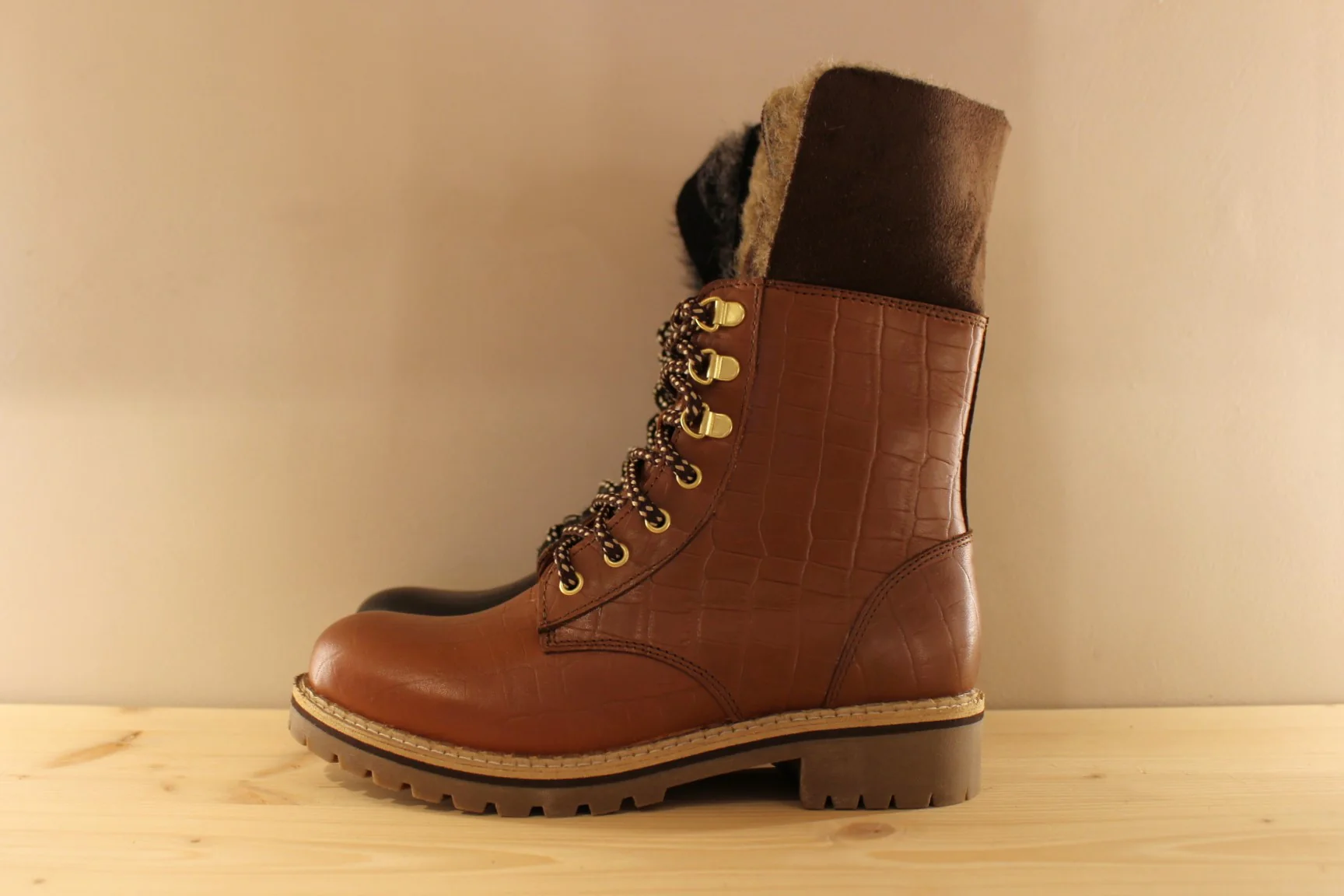 Bottines HOOPER Praz. Fabrication Portugaise. Bottines en cuir imprimé croco, de couleur noir, ou de couleur camel. Bottines doublées laine. Serrage lacets en coton sport. Hauteur de la tige de 22 cm, ou de 15 cm si retourné, avec haut de tige fourrure. Talon de 1.5 cm. Semelle extérieure en gomme épaisse de 2 cm, crantée. Couture aspect trépointe. Idéale en hiver sous la neige et avoir chaud en remontant la tige.