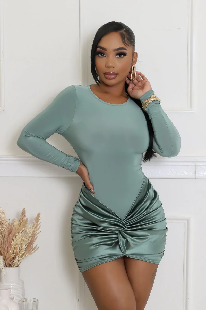 Robe extensible• Encolure ronde• Manches longues• Fermeture par fermoir body• Satin• 95 % polyester• 5 % élasthanne• Lavage à la main à froid• Le mannequin porte une taille S• Vente finaleAucun retour ni échange ne peut être effectué STATISTIQUES DU MANNEQUINHauteur : 5,3″Poitrine : 33″ / Taille : 28″ / Hanches : 42″