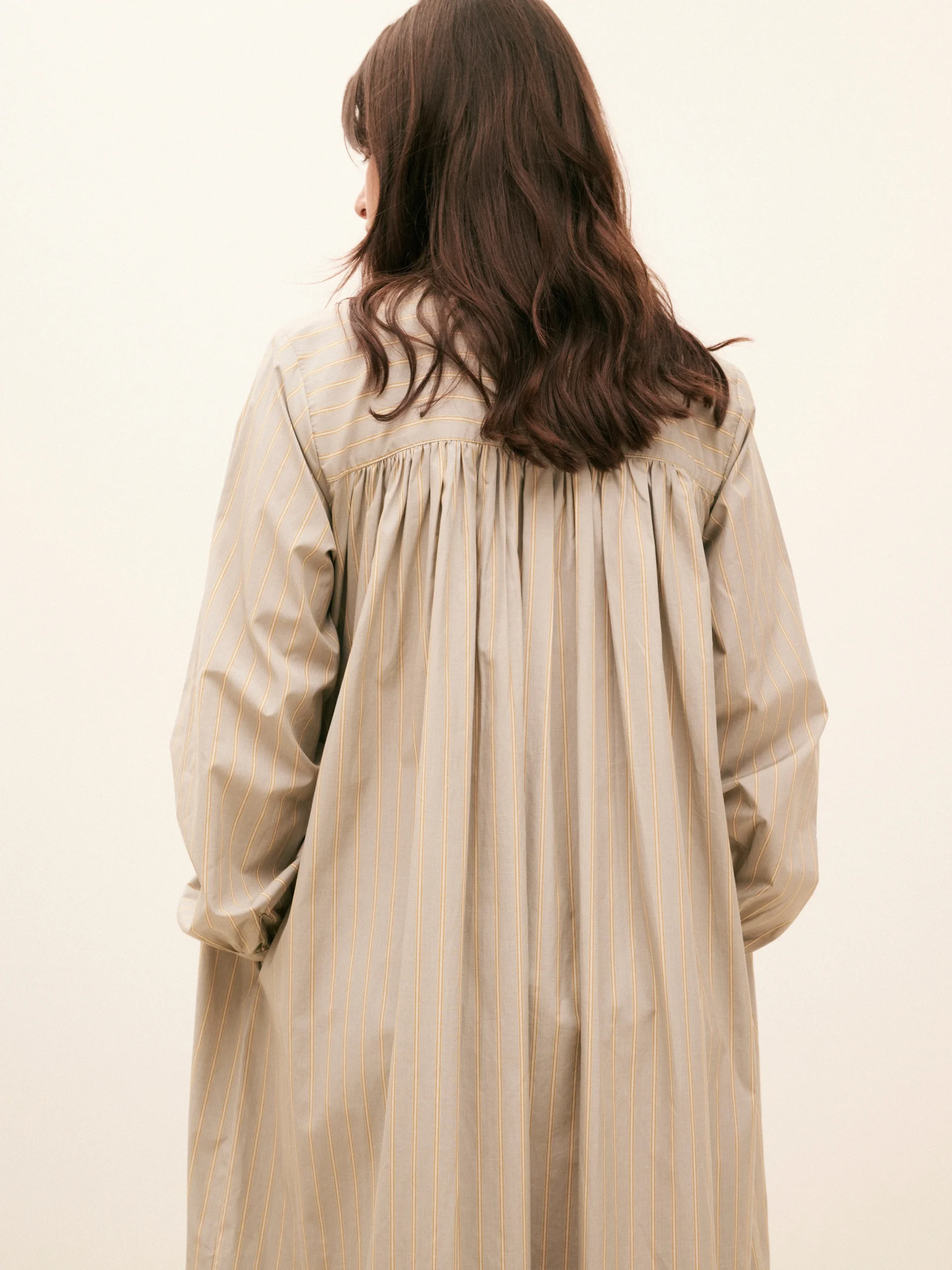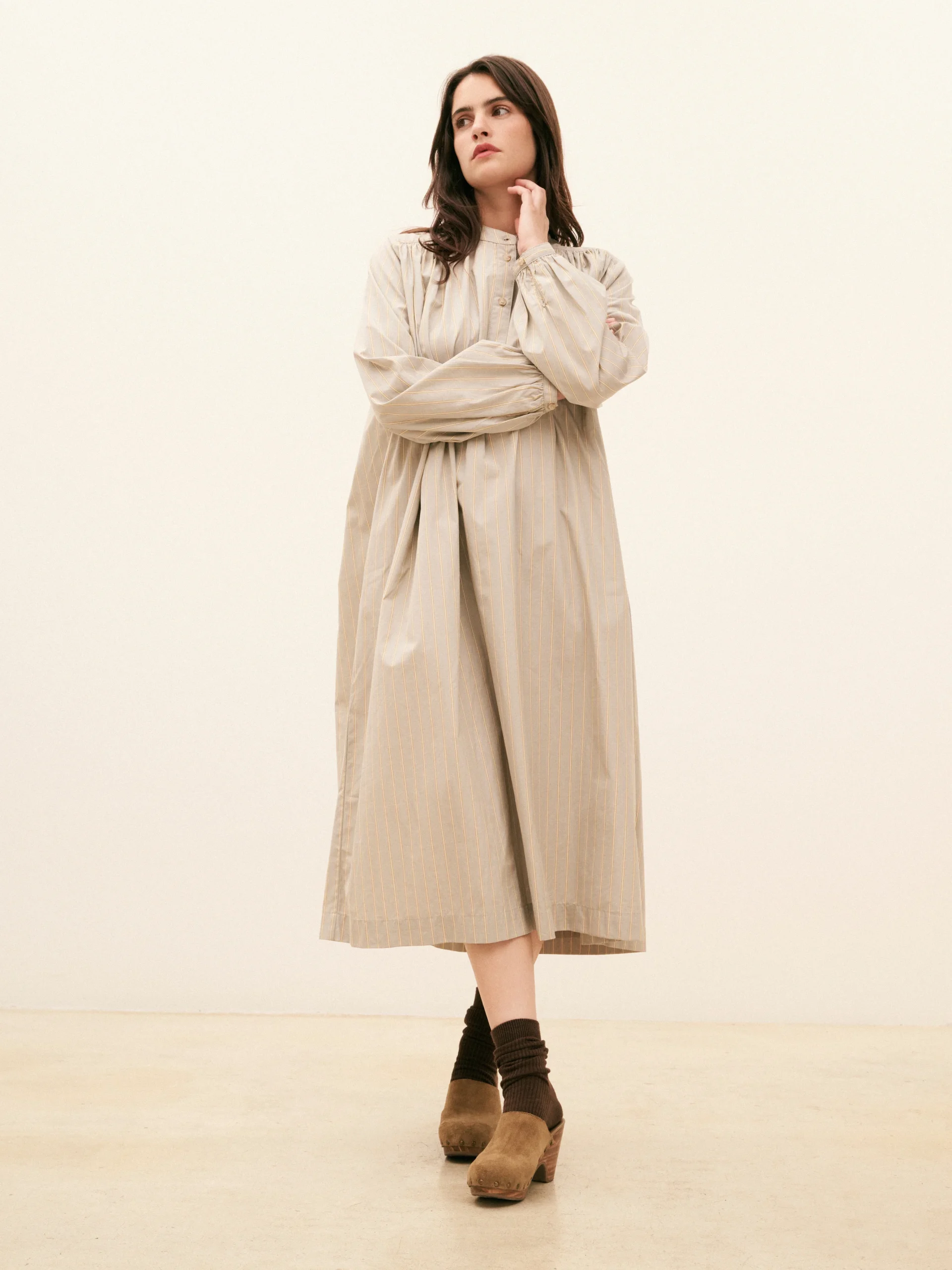 Lawrence est une robe longue. Elle possède un col Mao boutonné jusqu’à mi poitrine. Sa coupe est ample. Robe longue Manches longues Col Mao Boutons