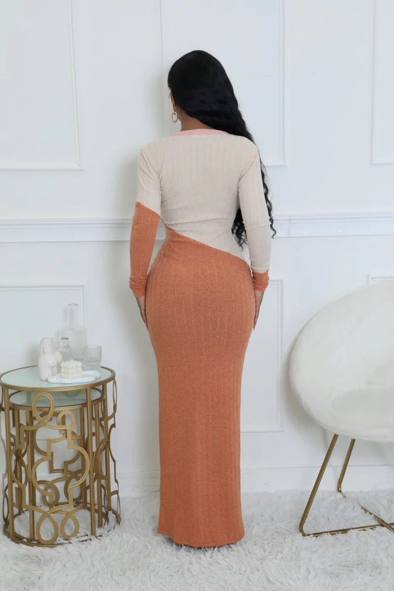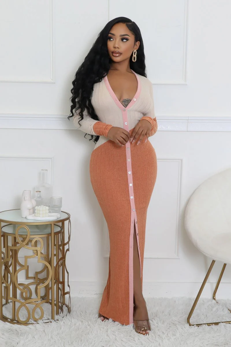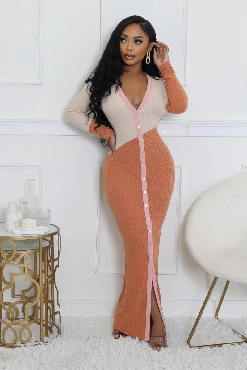 Robe longue extensible à manches longues boutons devant