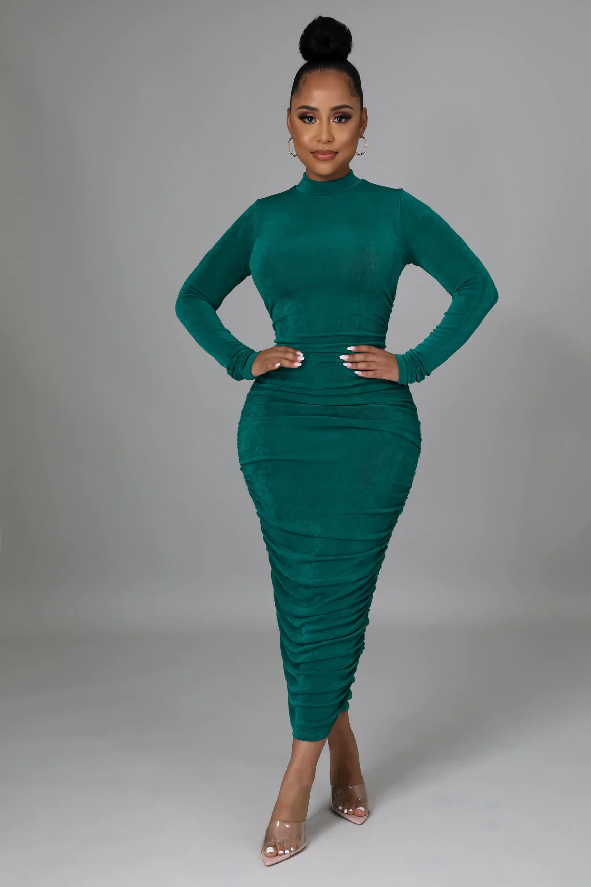 Robe longue semi-stretch à encolure ronde ruché