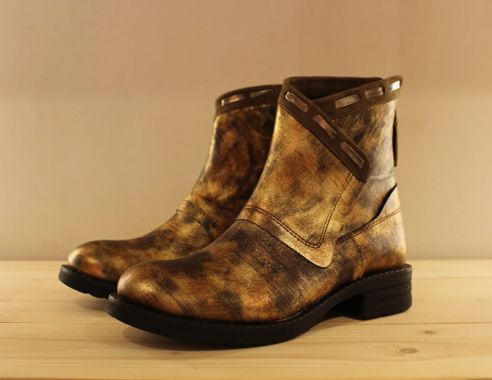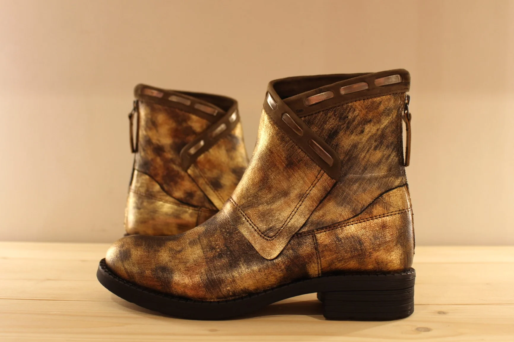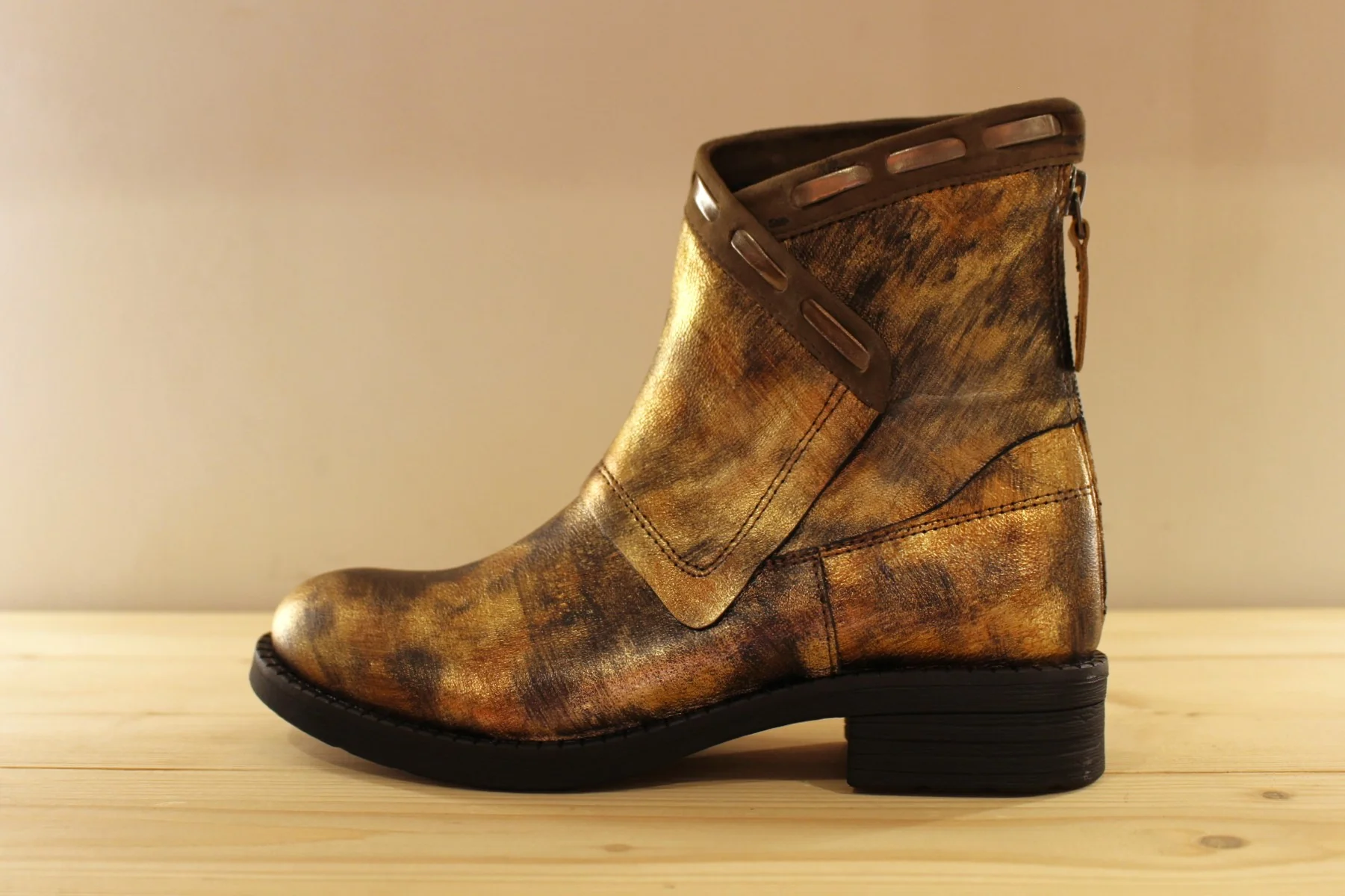 Chaussures CASTA Rupert. Fabrication Portugaise. Bottines en cuir métallisé et nuancé dans les tons de bronze cuivré. Zip arrière pour le passage du pied. Tige asymétrique avec finition veloursz et lacets métallisé. Chaussures doublées cuir. Semelle interne amovible. Hauteur de la tige de 15 cm. Talon de 2 cm. Semelle extérieure en gomme crantée épaisse de 2 cm. Quel élégance et originalité.