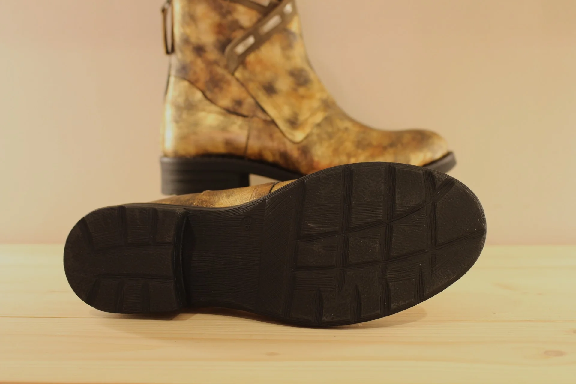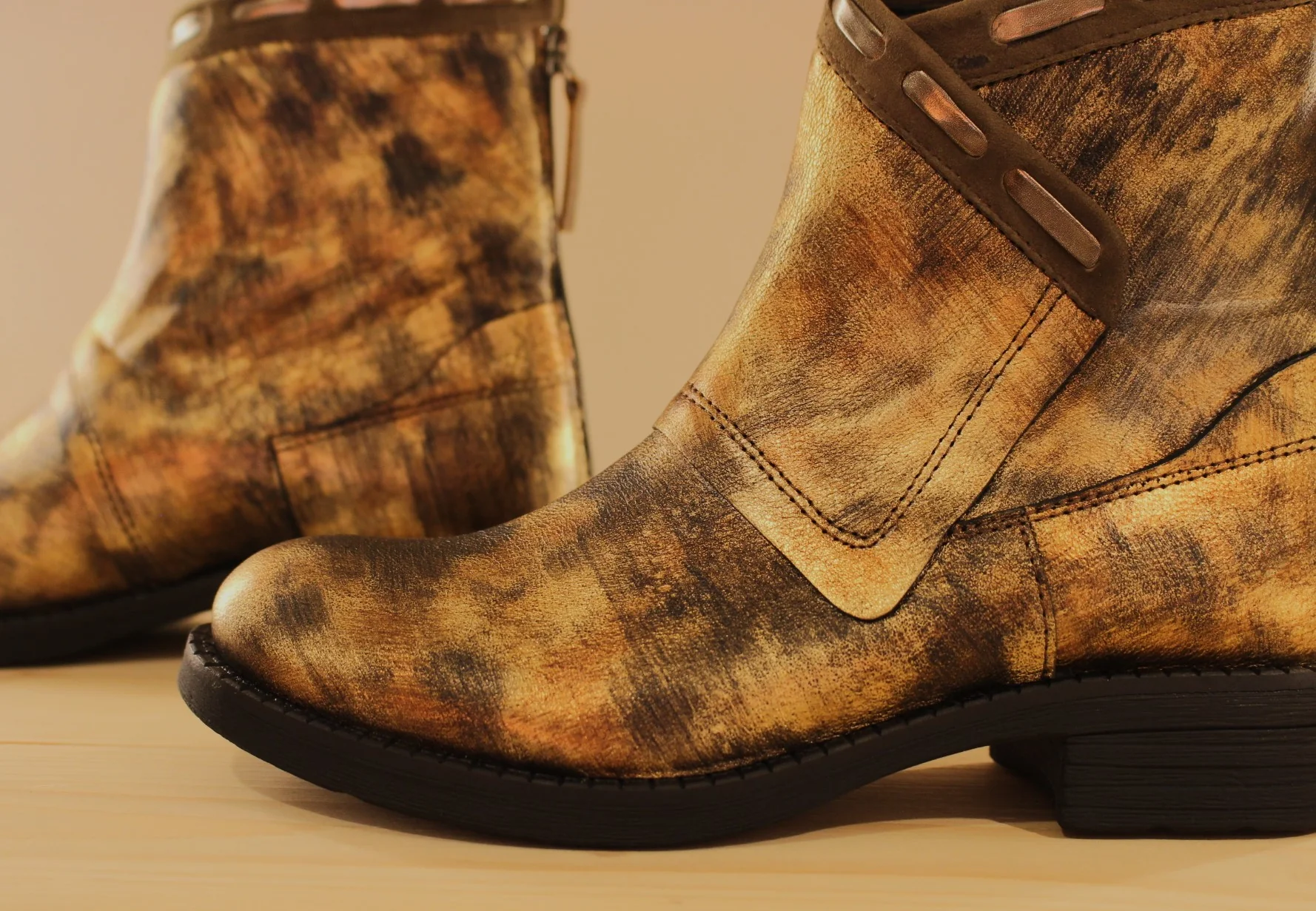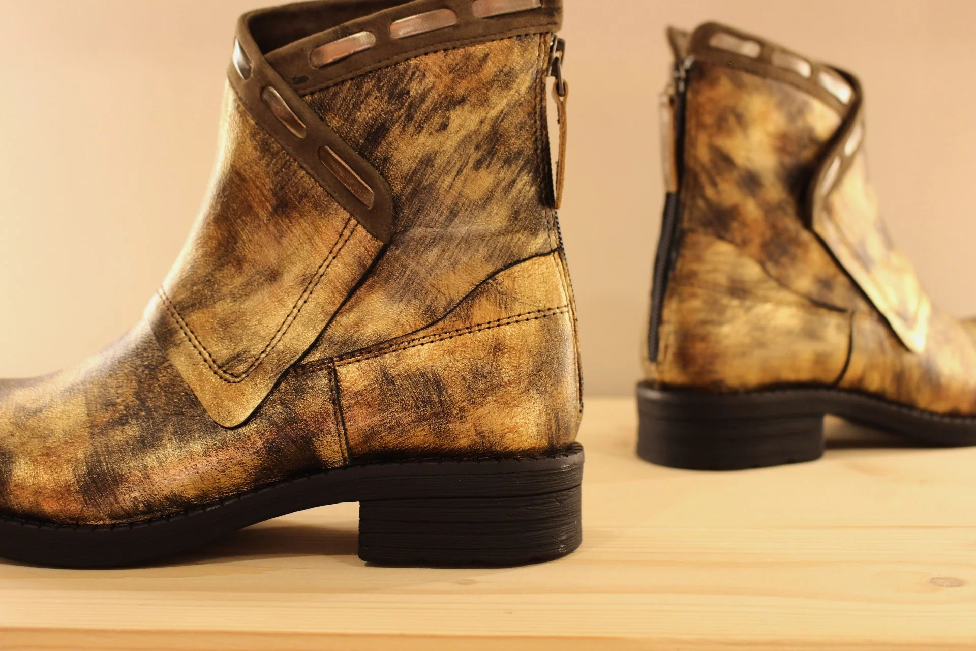 Chaussures CASTA Rupert. Fabrication Portugaise. Bottines en cuir métallisé et nuancé dans les tons de bronze cuivré. Zip arrière pour le passage du pied. Tige asymétrique avec finition veloursz et lacets métallisé. Chaussures doublées cuir. Semelle interne amovible. Hauteur de la tige de 15 cm. Talon de 2 cm. Semelle extérieure en gomme crantée épaisse de 2 cm. Quel élégance et originalité.