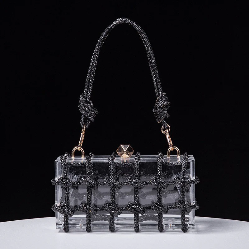 CORDE POCHETTE ACRYLIQUE STRASS SOIRSAC D’ÉPAULE Fermeture : fermeture supérieure à verrouillage par boucle de levageHauteur de la poignée : 7 poignée extérieure en strassDimensions : 7,5″ de longueur × 3″ de largeur × 4″ de hauteur