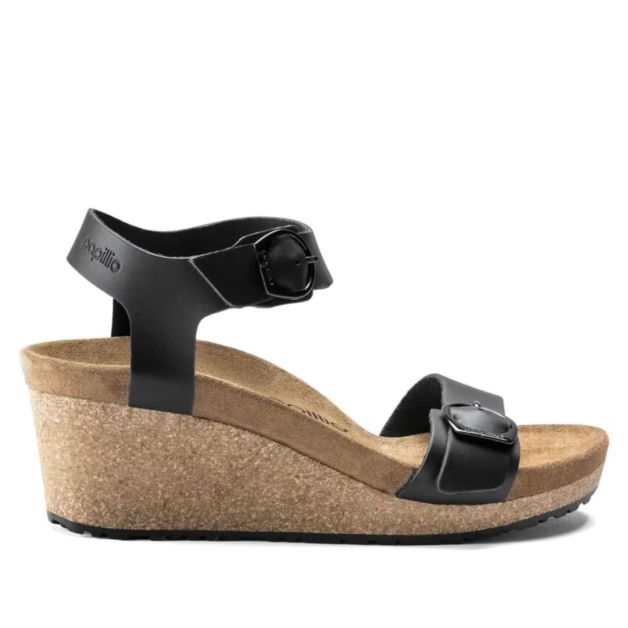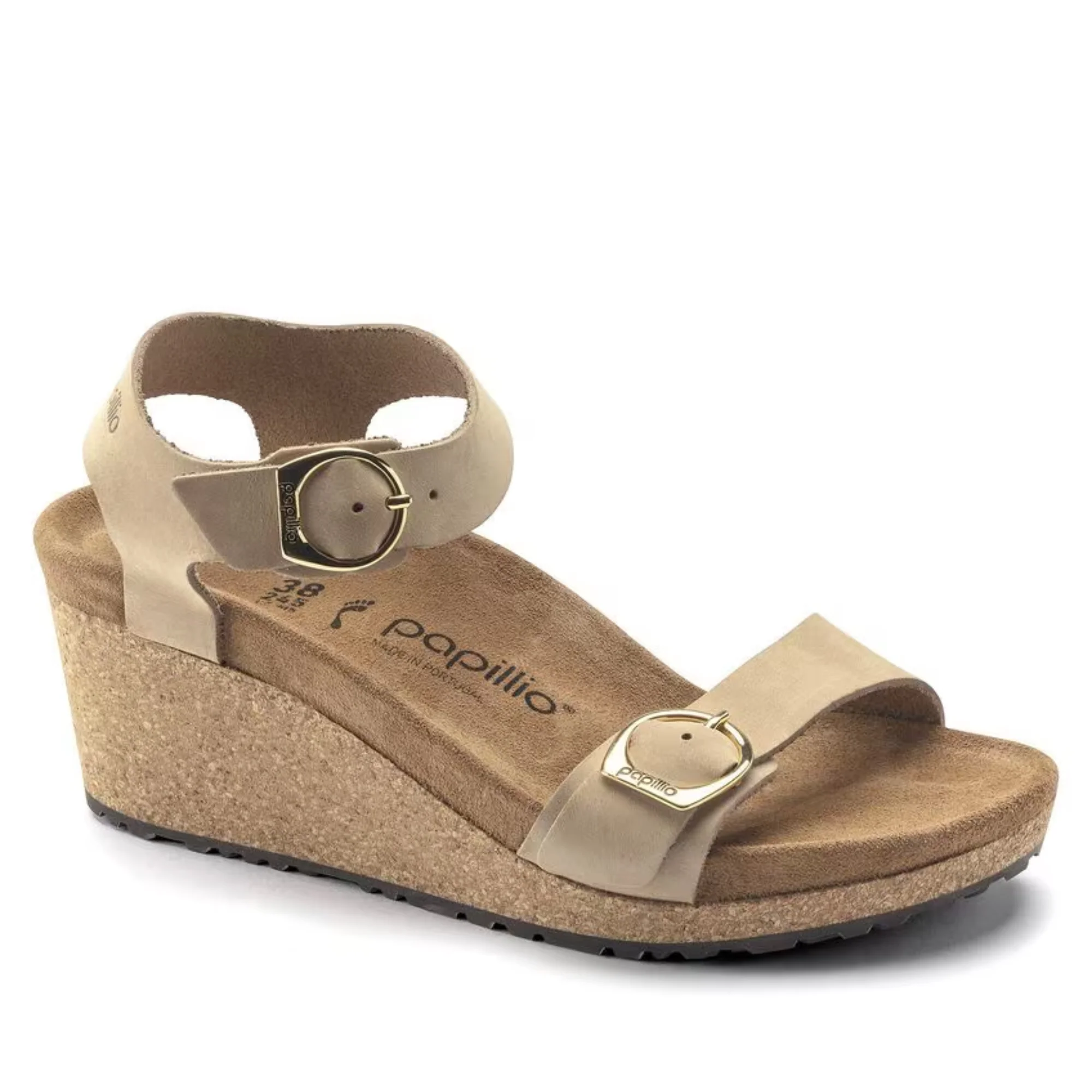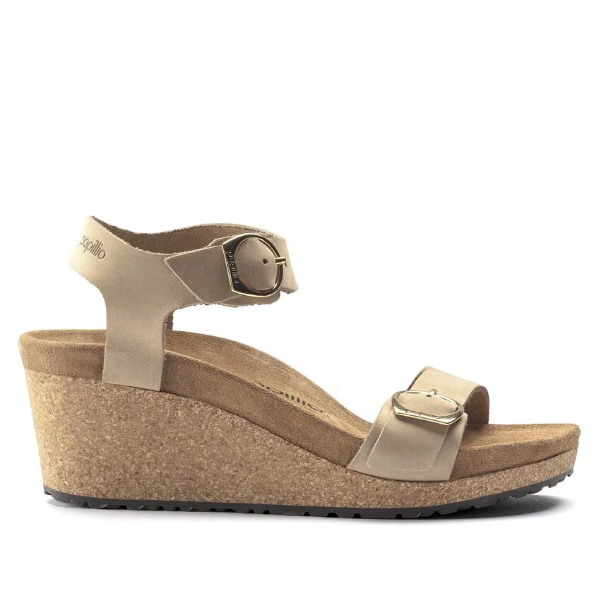 La Soley allie le confort de l’assise plantaire BIRKENSTOCK anatomique à une semelle compensée en liège, le tout sans ajouter de pression sur l’avant du pied. En cuir nubuck légèrement brossé, elle s’associe à d’élégantes boucles arrondies. Améliorez votre confort.