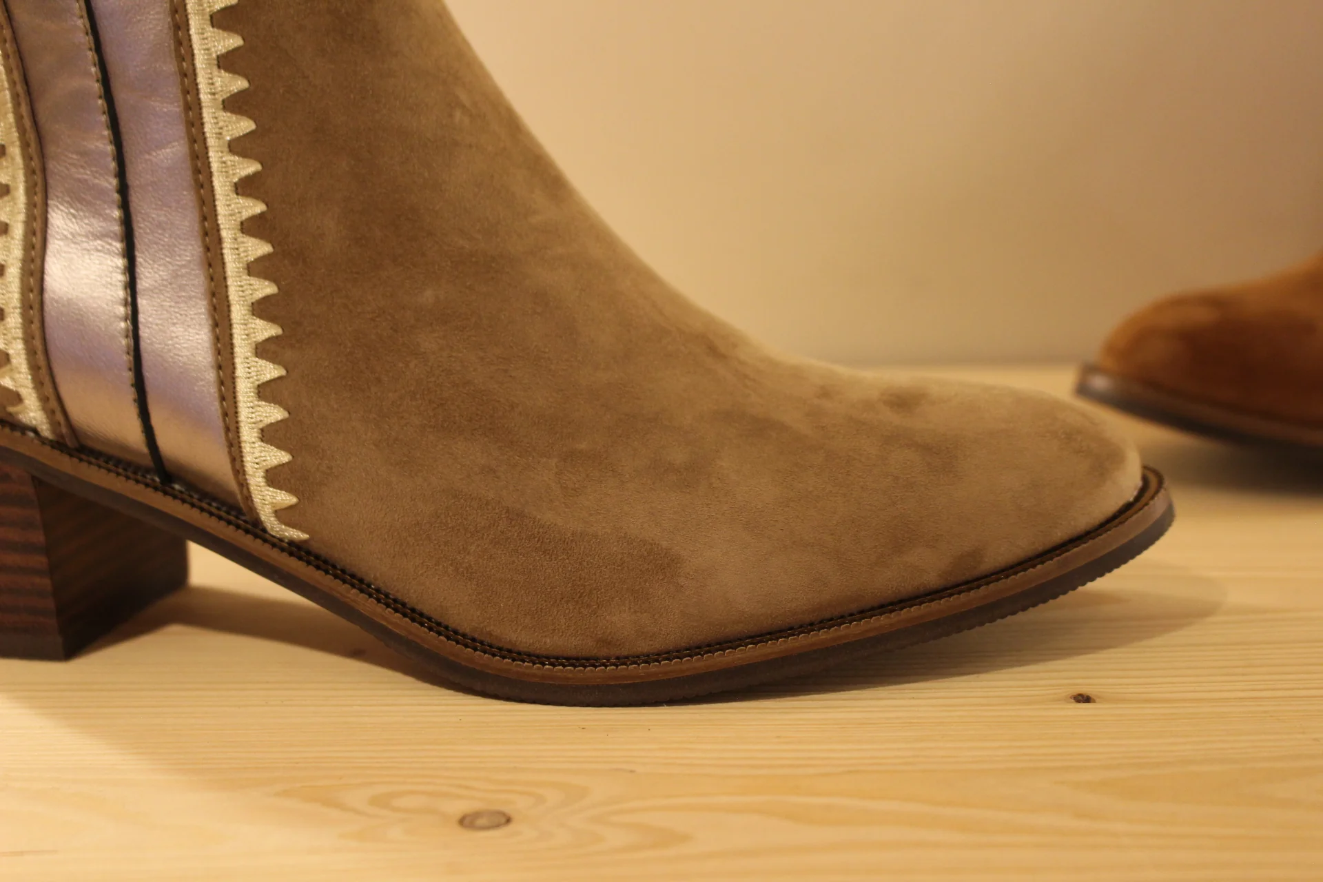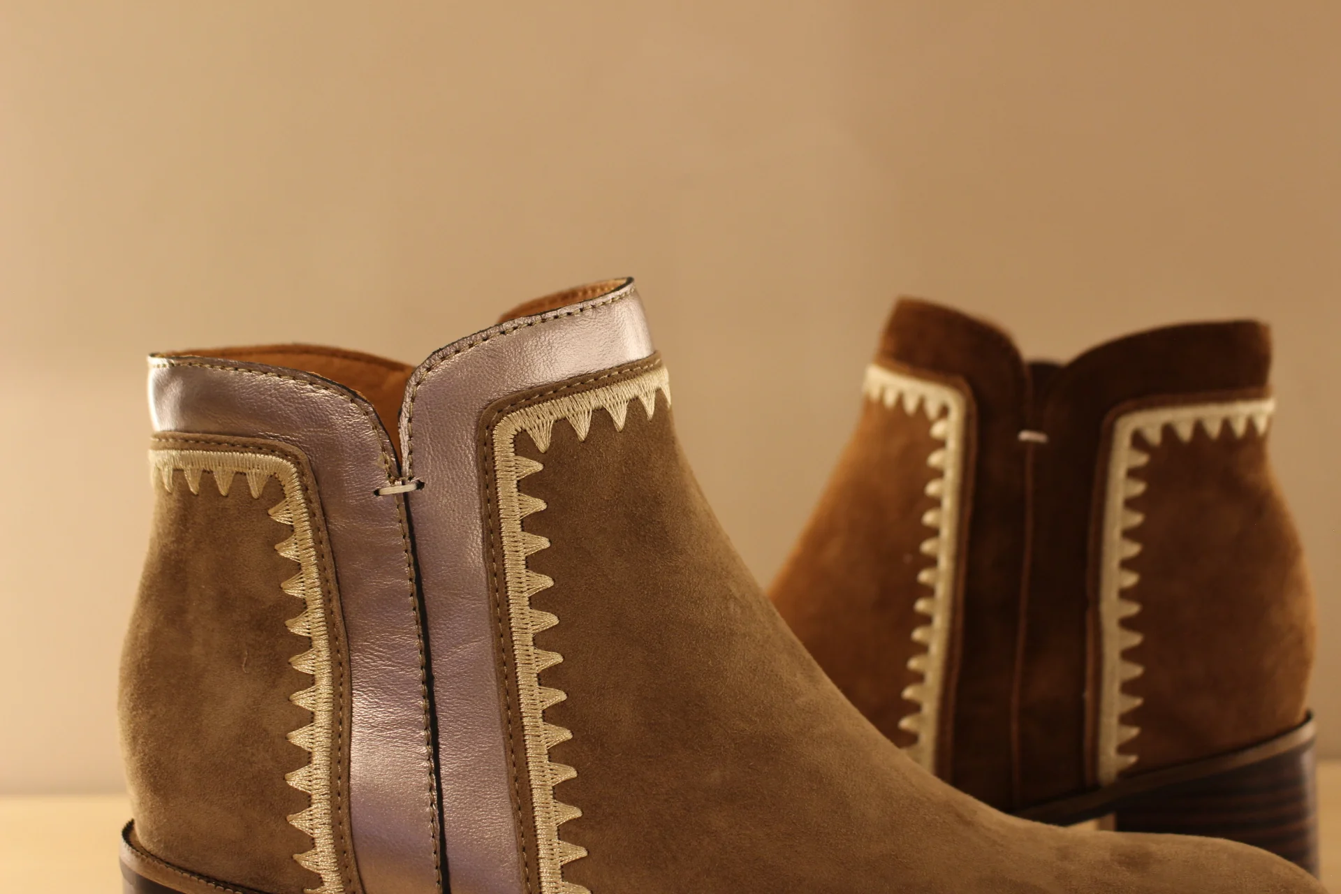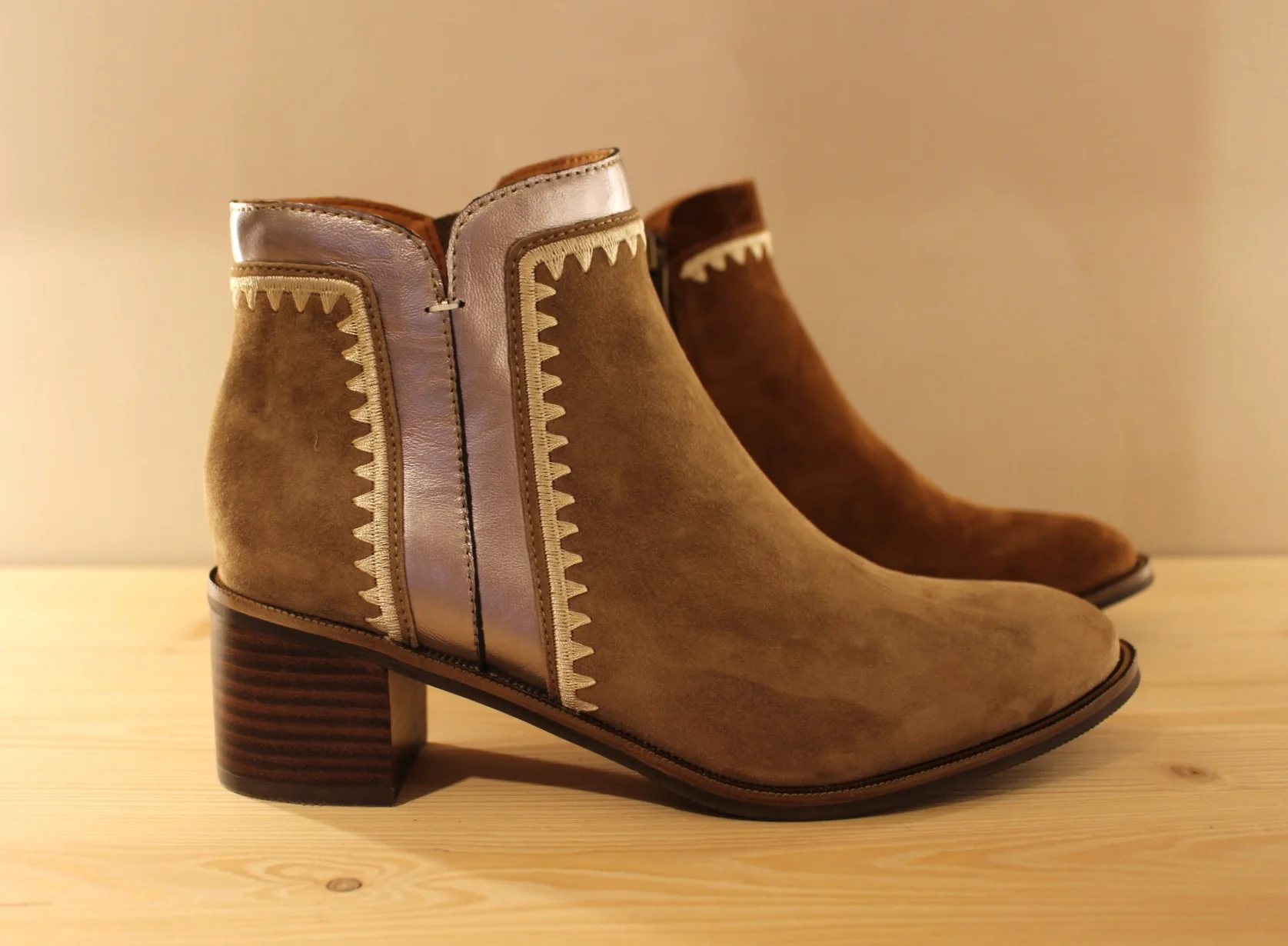 Chaussures MAMZELLE – Topic. Bottine en cuir velours de couleur greige et cuir métallisé ou de couleur noisette et chocolat. Couture décorative sur les quartiers et le tour de cheville. Hauteur de la tige de 13 cm. Zip du côté interne. Chaussures doublées cuir. Semelle externe en gomme de 1 cm. Talon de 4.5 cm. Un côté légèrement décalé et efficace au quotidien.
