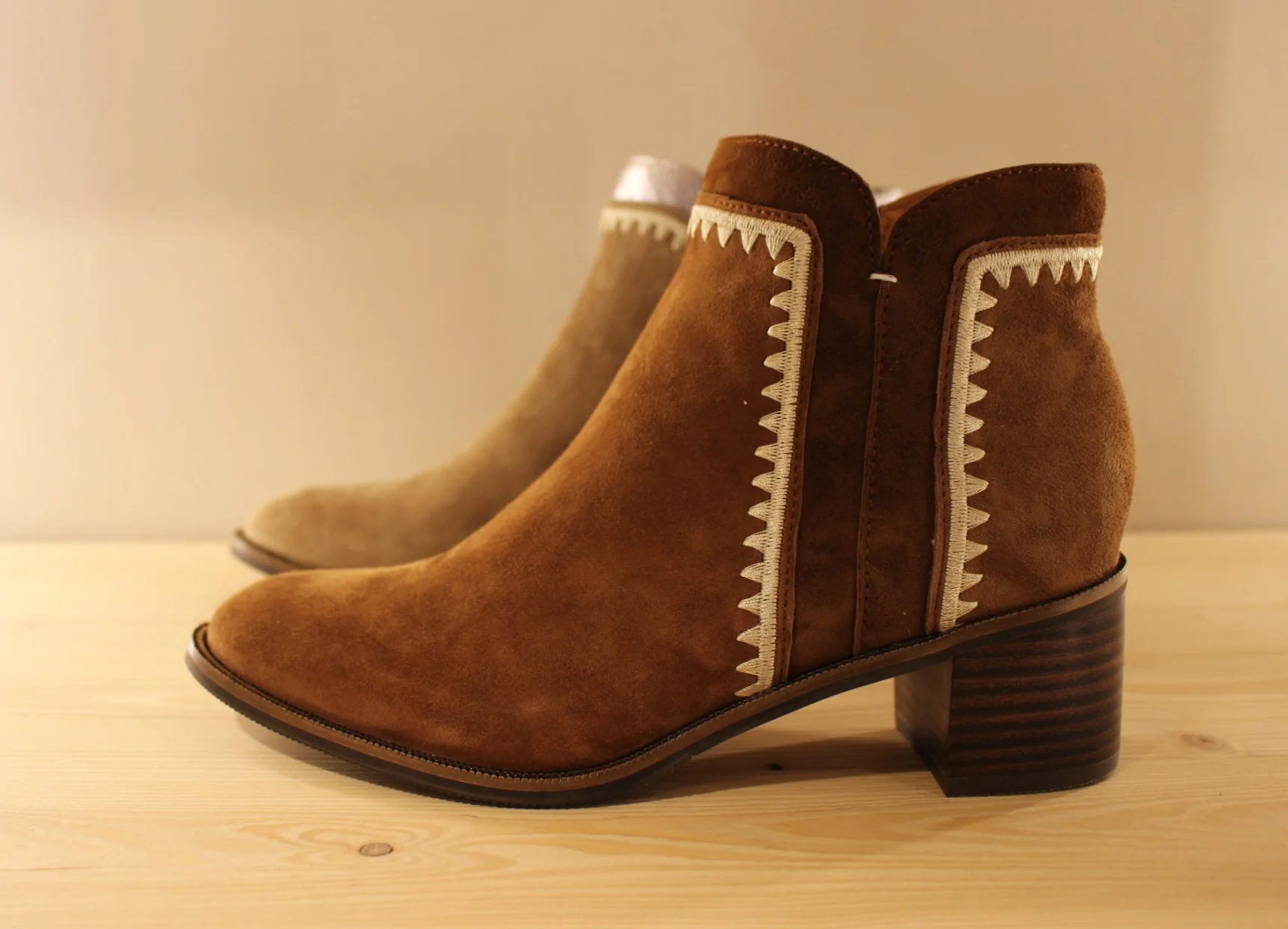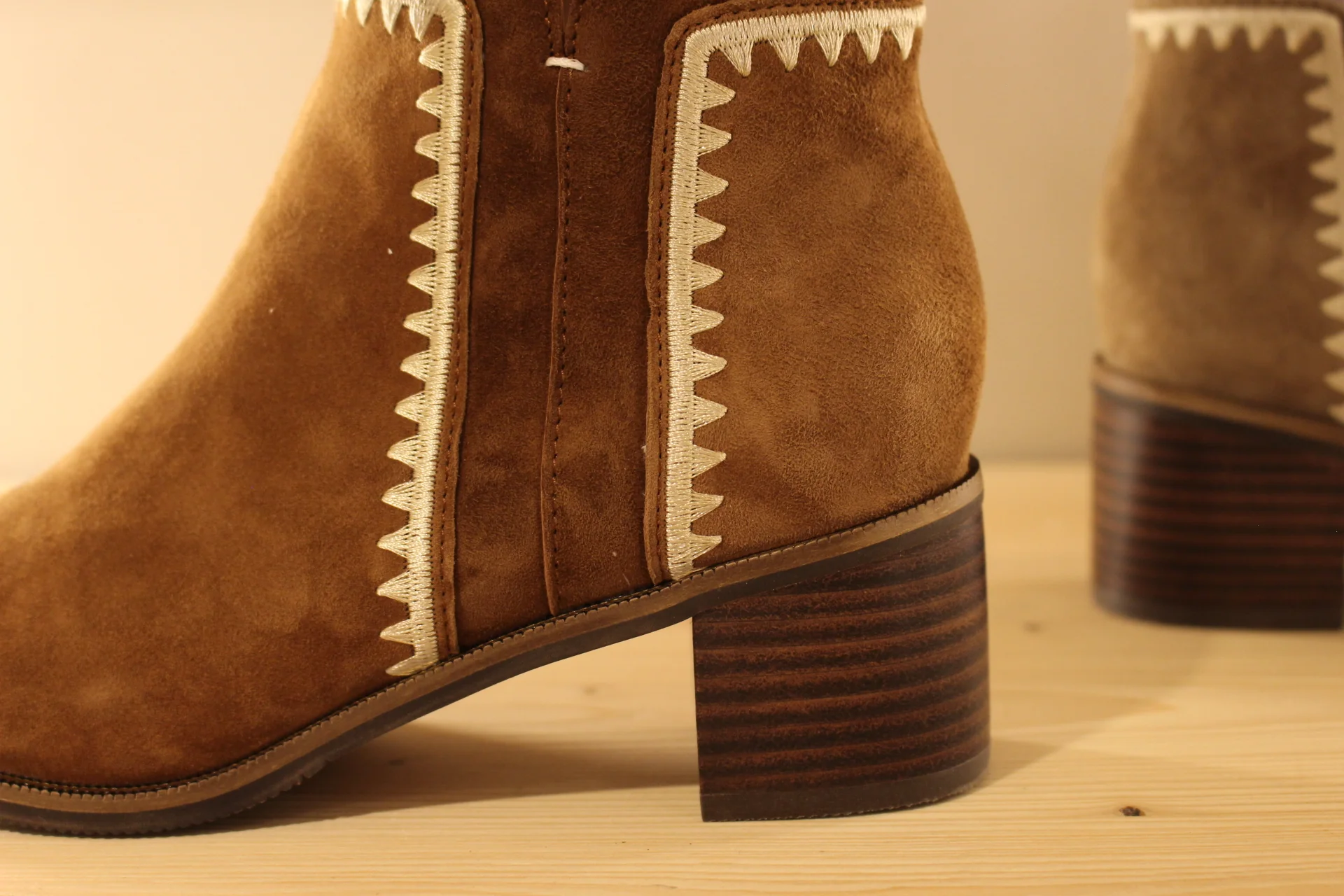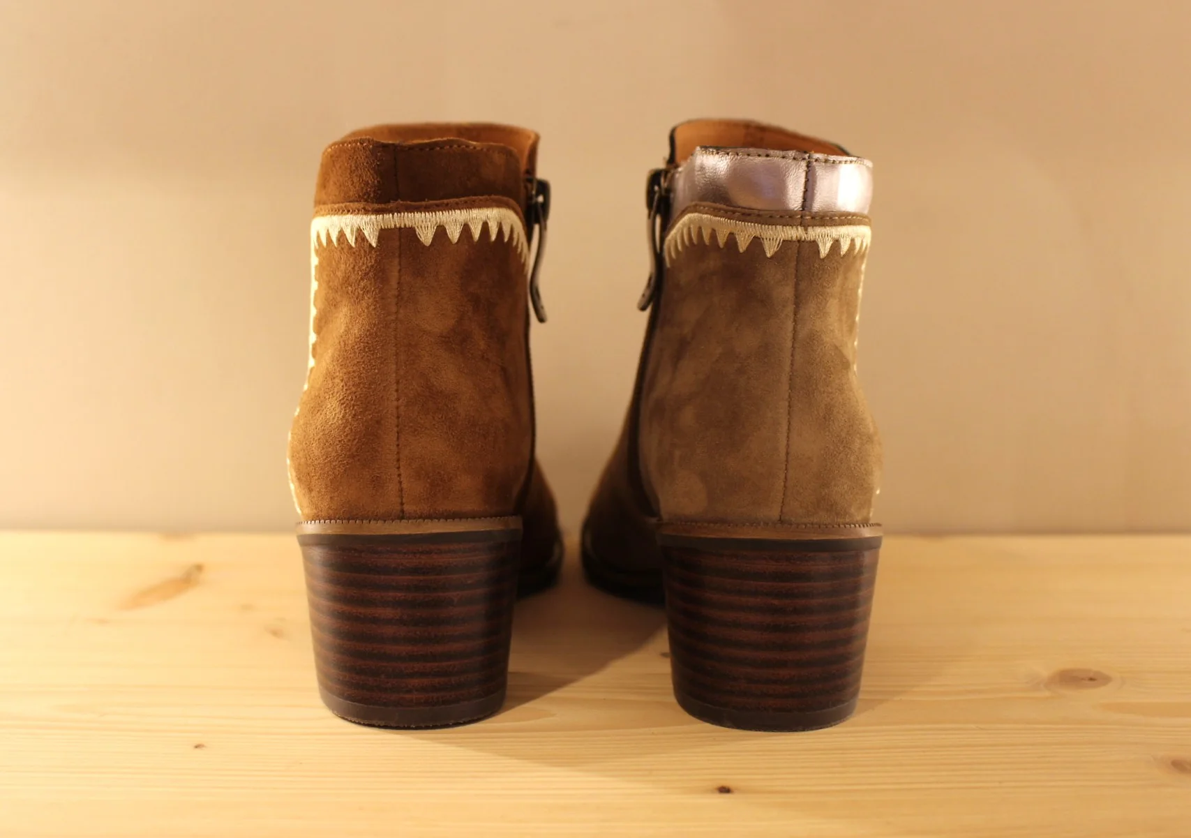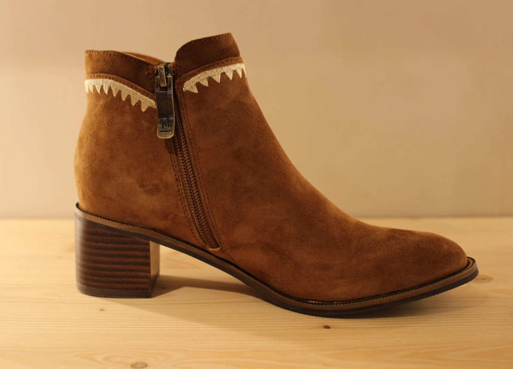 Chaussures MAMZELLE – Topic. Bottine en cuir velours de couleur greige et cuir métallisé ou de couleur noisette et chocolat. Couture décorative sur les quartiers et le tour de cheville. Hauteur de la tige de 13 cm. Zip du côté interne. Chaussures doublées cuir. Semelle externe en gomme de 1 cm. Talon de 4.5 cm. Un côté légèrement décalé et efficace au quotidien.