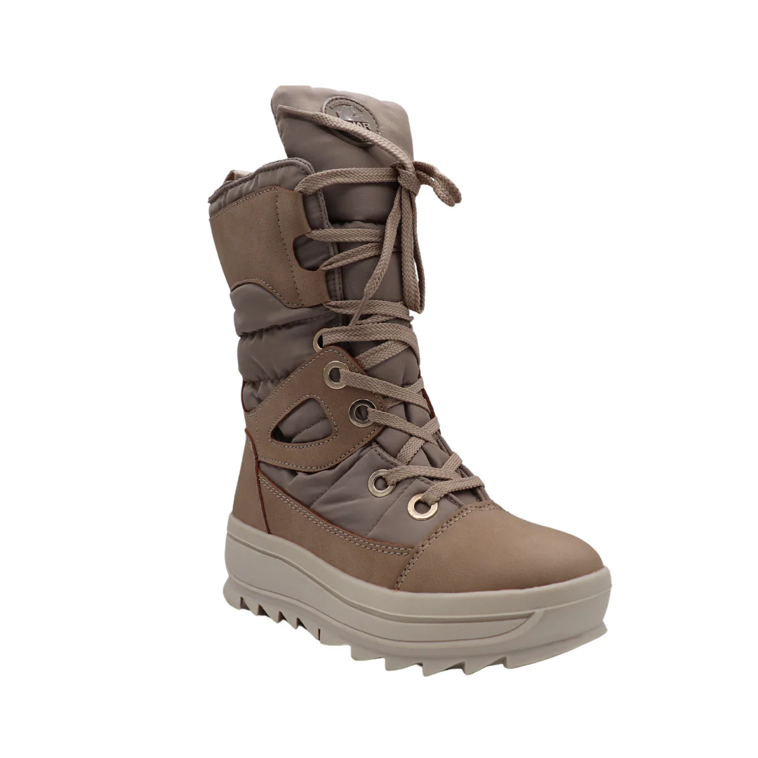 Matériaux : Nylon ferreux et Nubuck végétalien Doublure supérieure : Fausse fourrure de botte Construction : Semelle en caoutchouc thermique Toboggan Imperméabilité : Chausson à coutures isolantes 400 Hauteur 8.5 po Confort évalué à -30°C