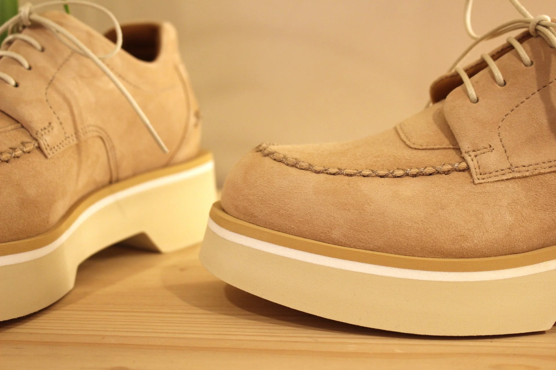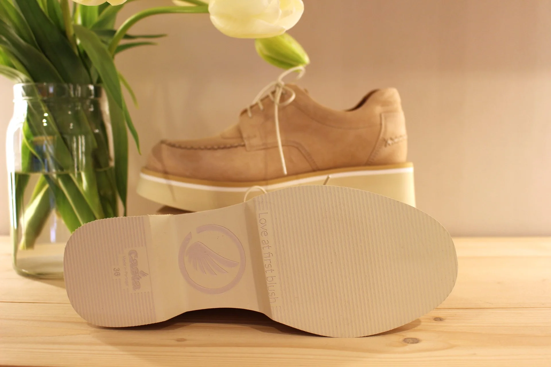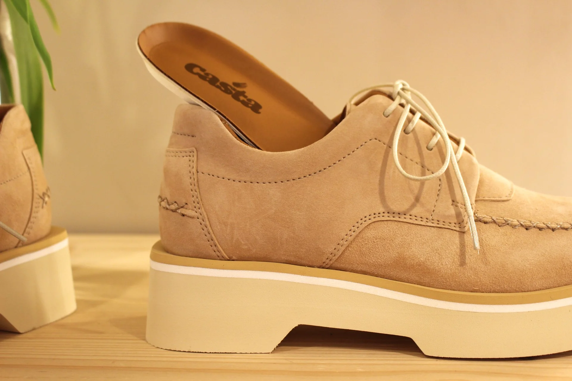 Chaussures CASTA – Valérie. Fabrication portugaise. Derby en cuir velours de couleur camel. Surpiqûres apparentes. Serrage lacets coton beige. Chaussures doublées cuir et semelle interne amovible. Semelle externe en gomme extra légère et amortissante de 4.5 cm. Talon de 1.5 cm. La bande beige sur la semelle vient bien contraster.. Un derby très chic et léger.