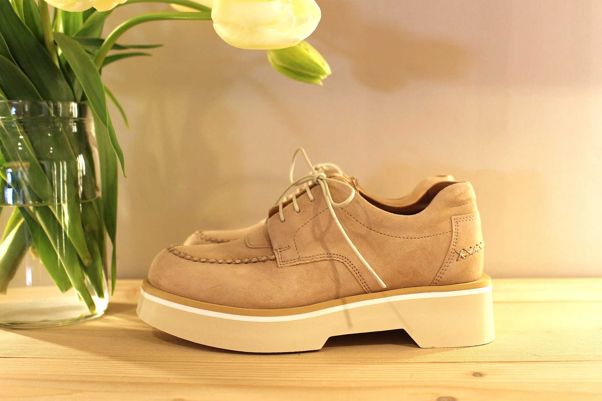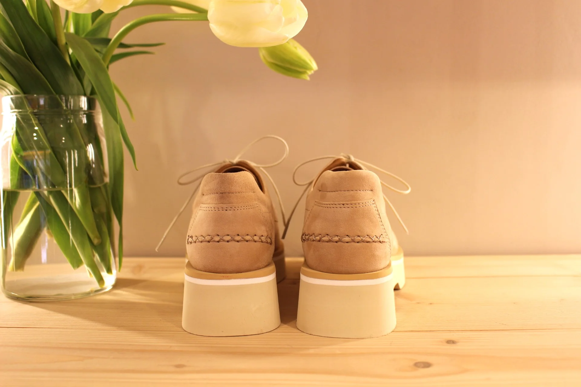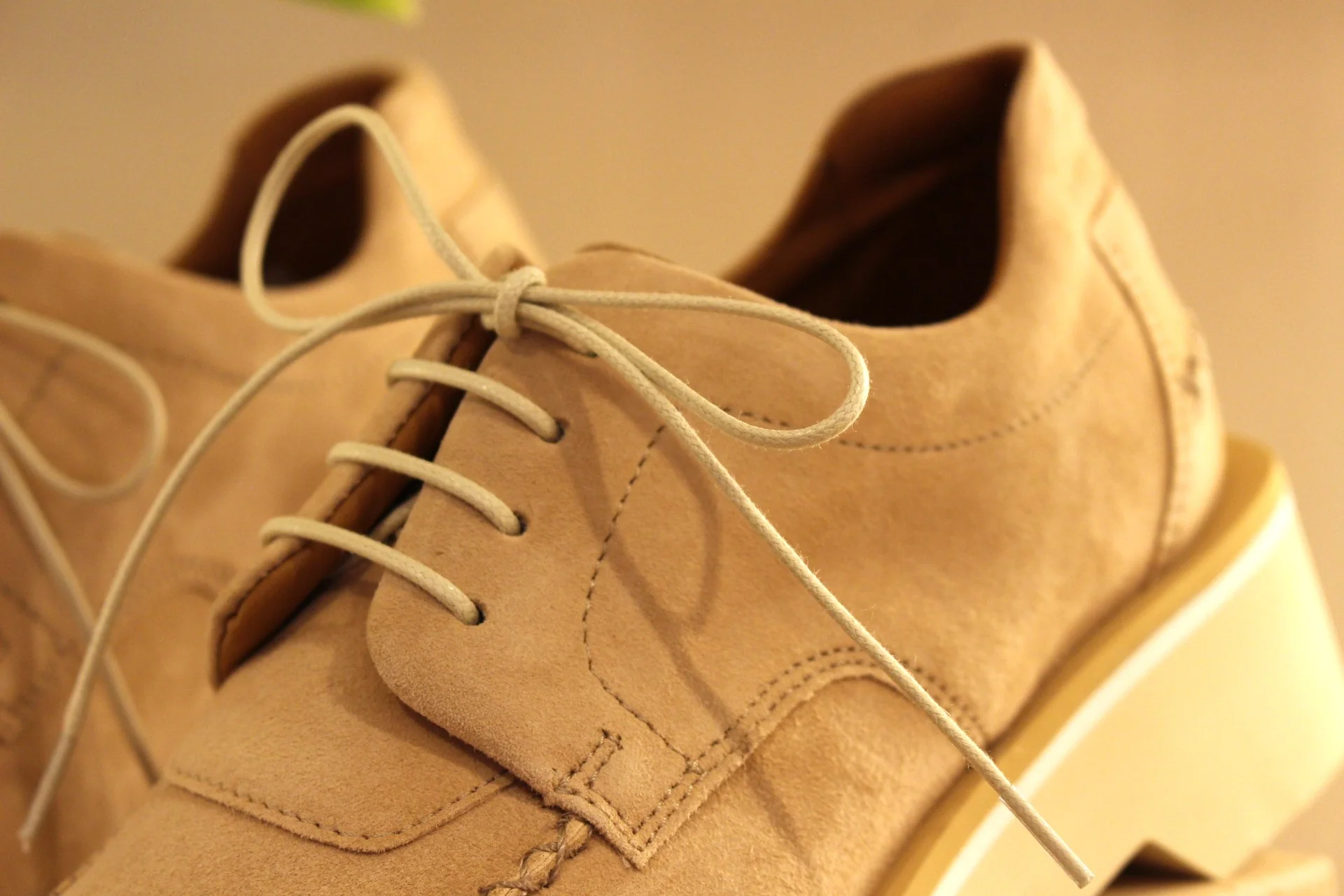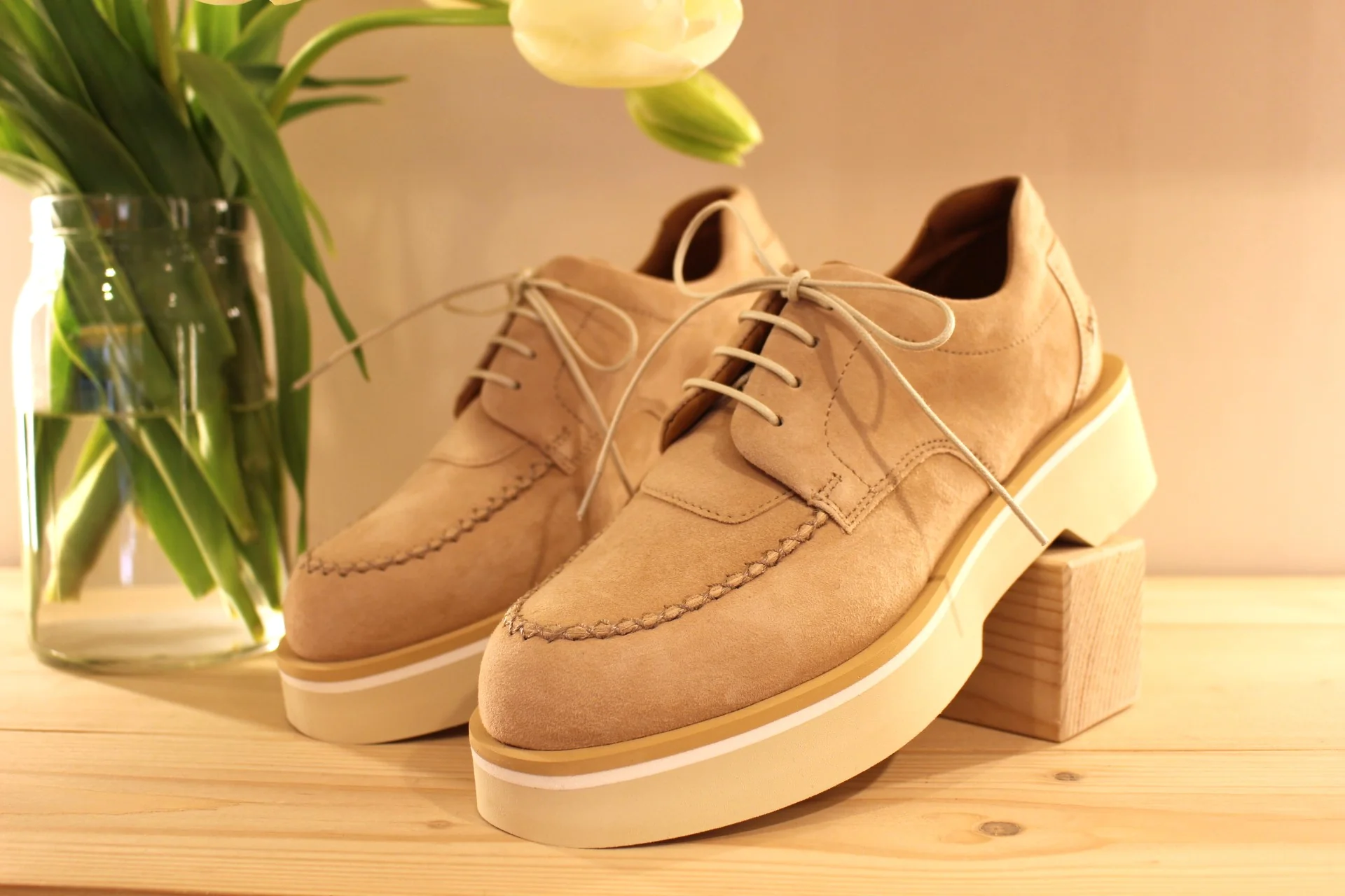 Chaussures CASTA – Valérie. Fabrication portugaise. Derby en cuir velours de couleur camel. Surpiqûres apparentes. Serrage lacets coton beige. Chaussures doublées cuir et semelle interne amovible. Semelle externe en gomme extra légère et amortissante de 4.5 cm. Talon de 1.5 cm. La bande beige sur la semelle vient bien contraster.. Un derby très chic et léger.