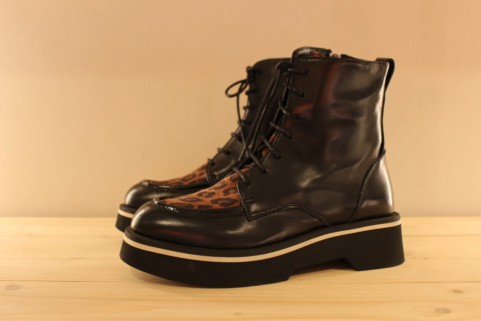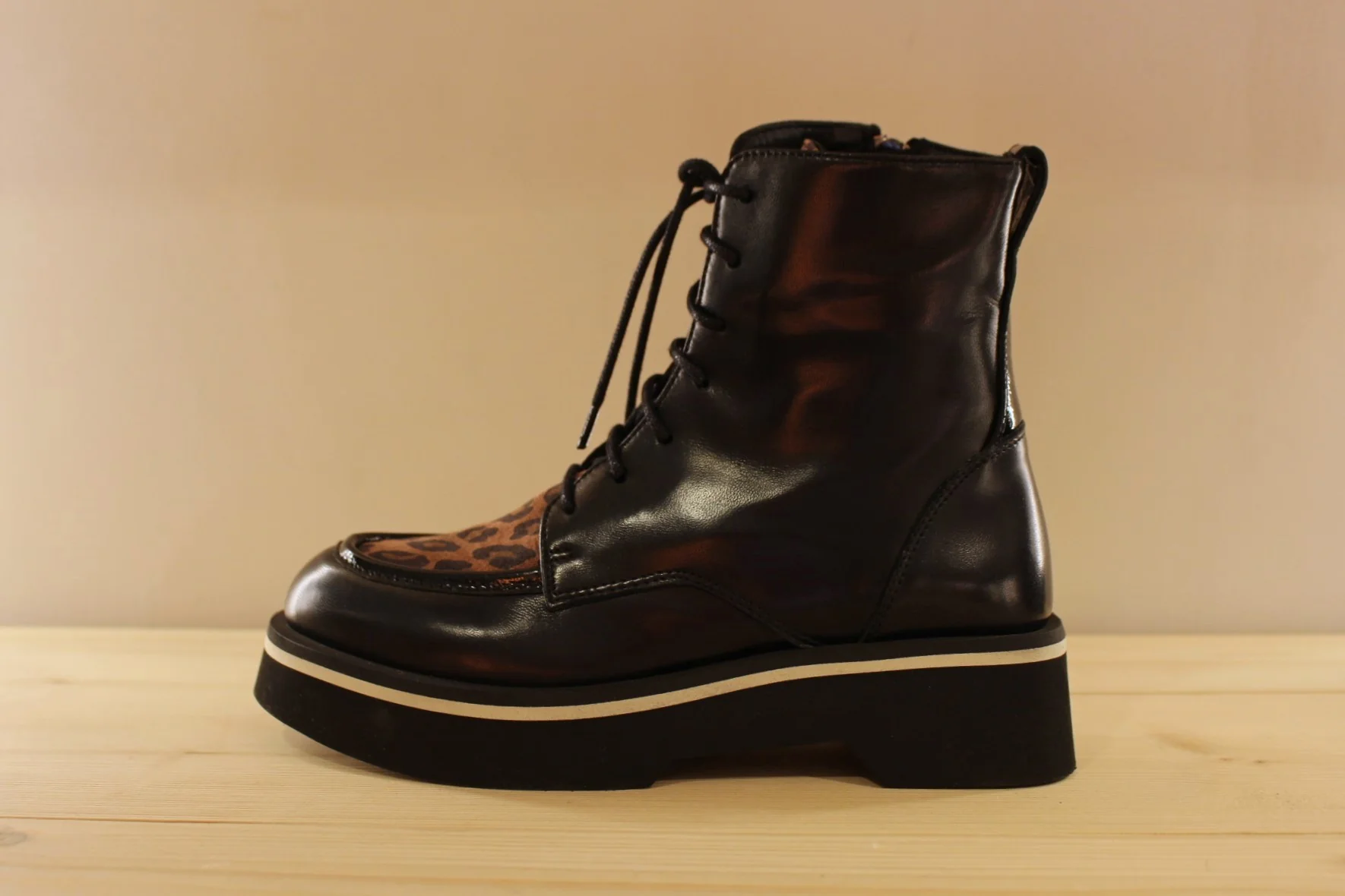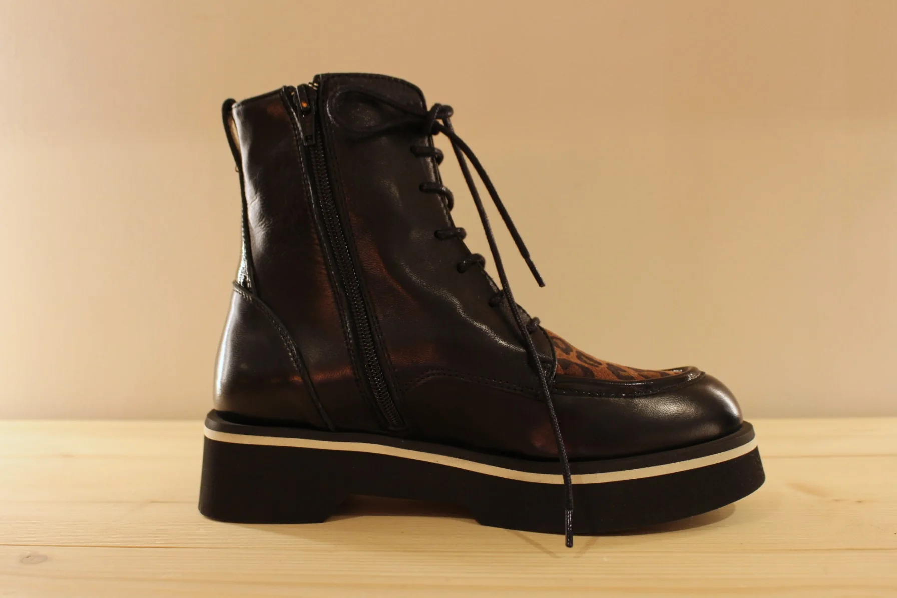 Bottines CASTA Volt. Fabrication portugaise. Bottines en cuir de couleur noir et claque sur thème animal dans les tons de camel. Serrage lacets coton noir. Zip du côté interne. Bottines de 16 cm. Chaussures doublées cuir et semelle interne amovible. Semelle externe en gomme extra légère et amortissante de 4.5 cm. Talon de 1.5 cm. Une bottine très lookée et très légère !