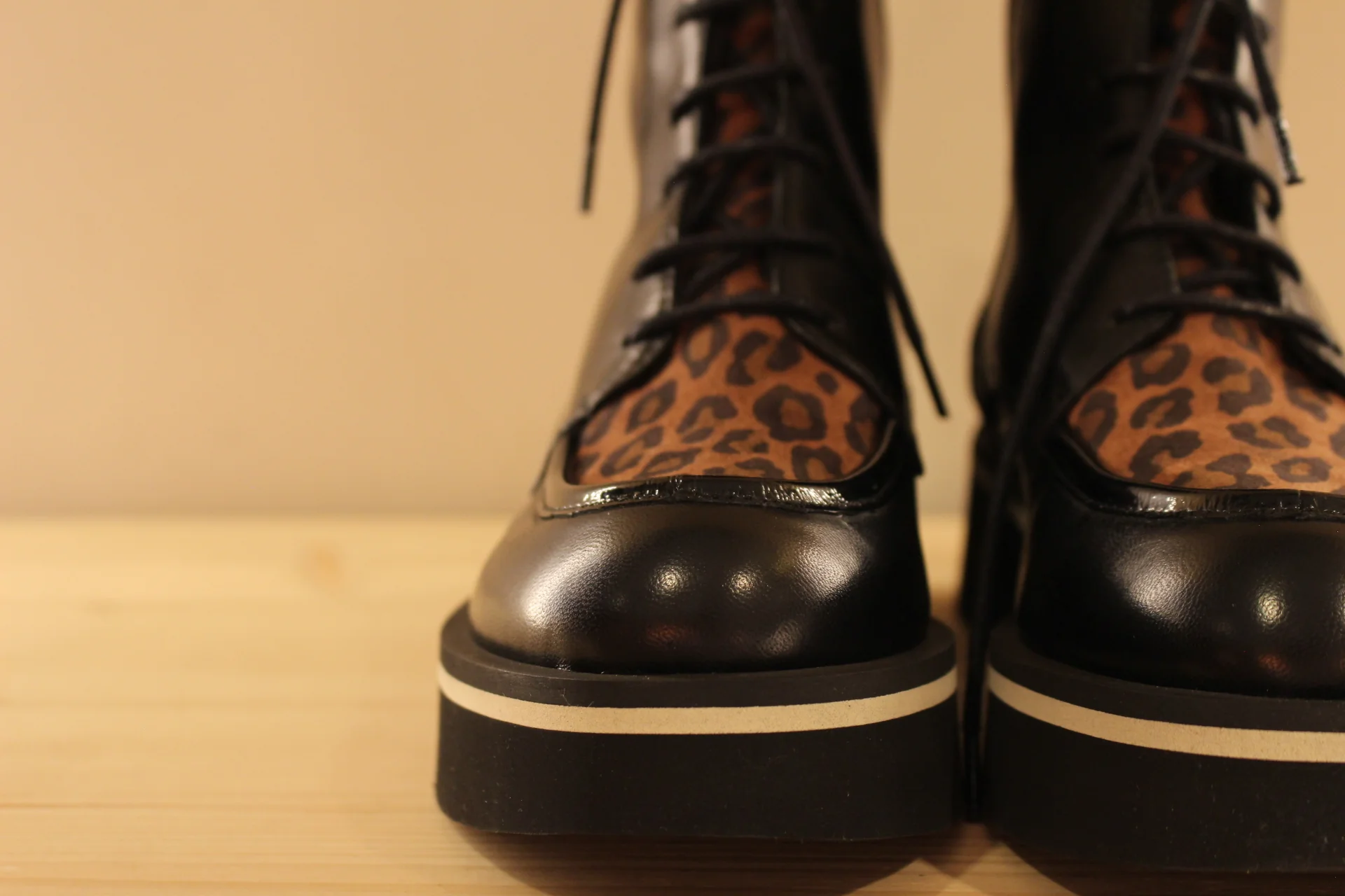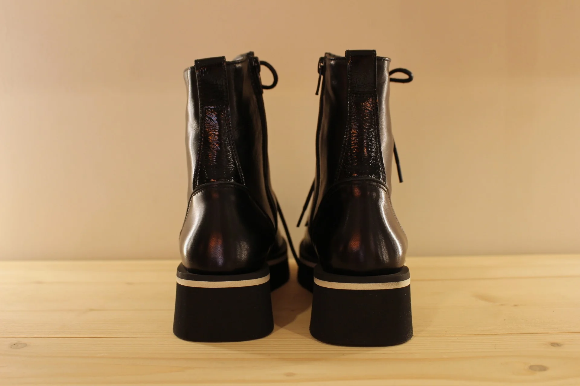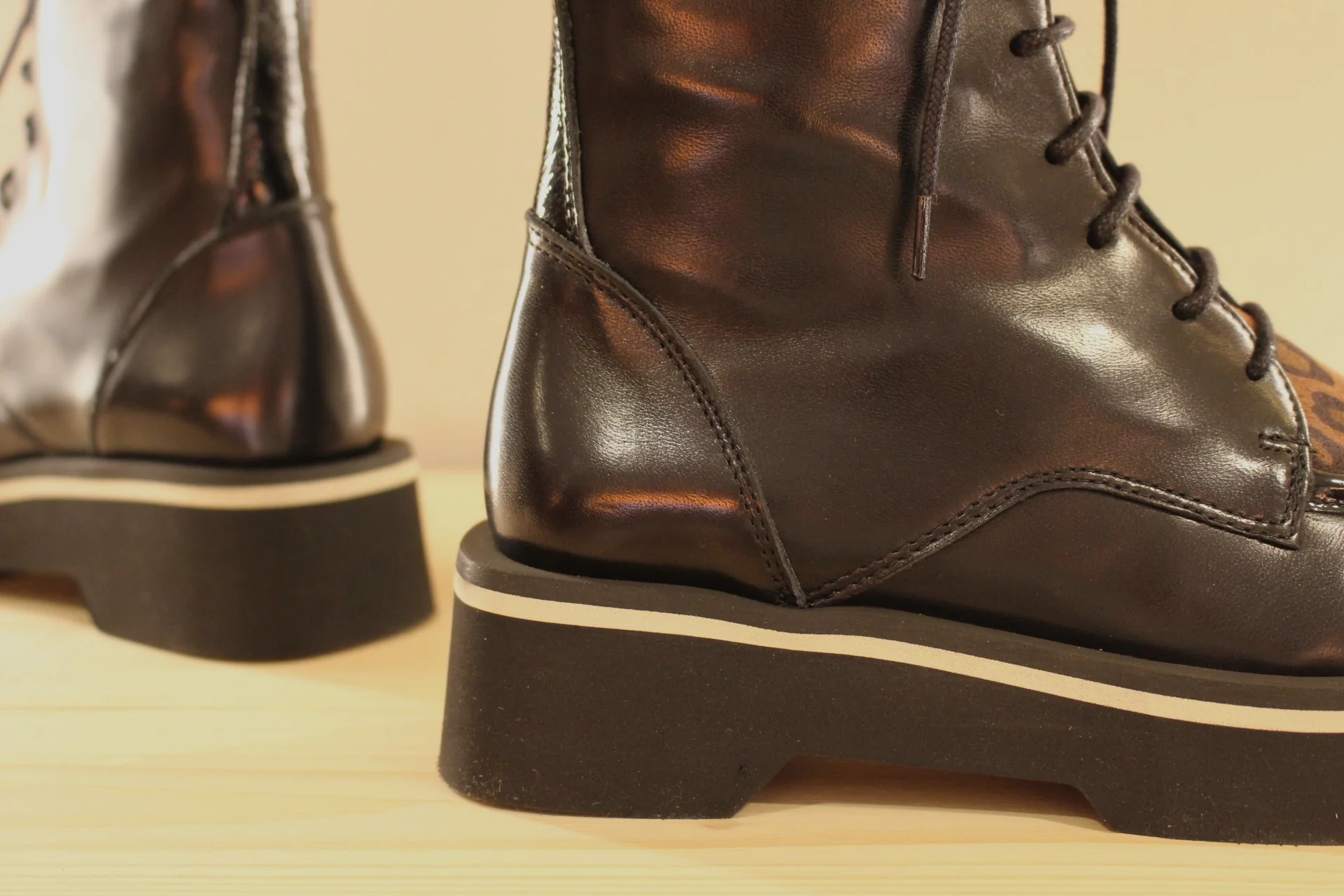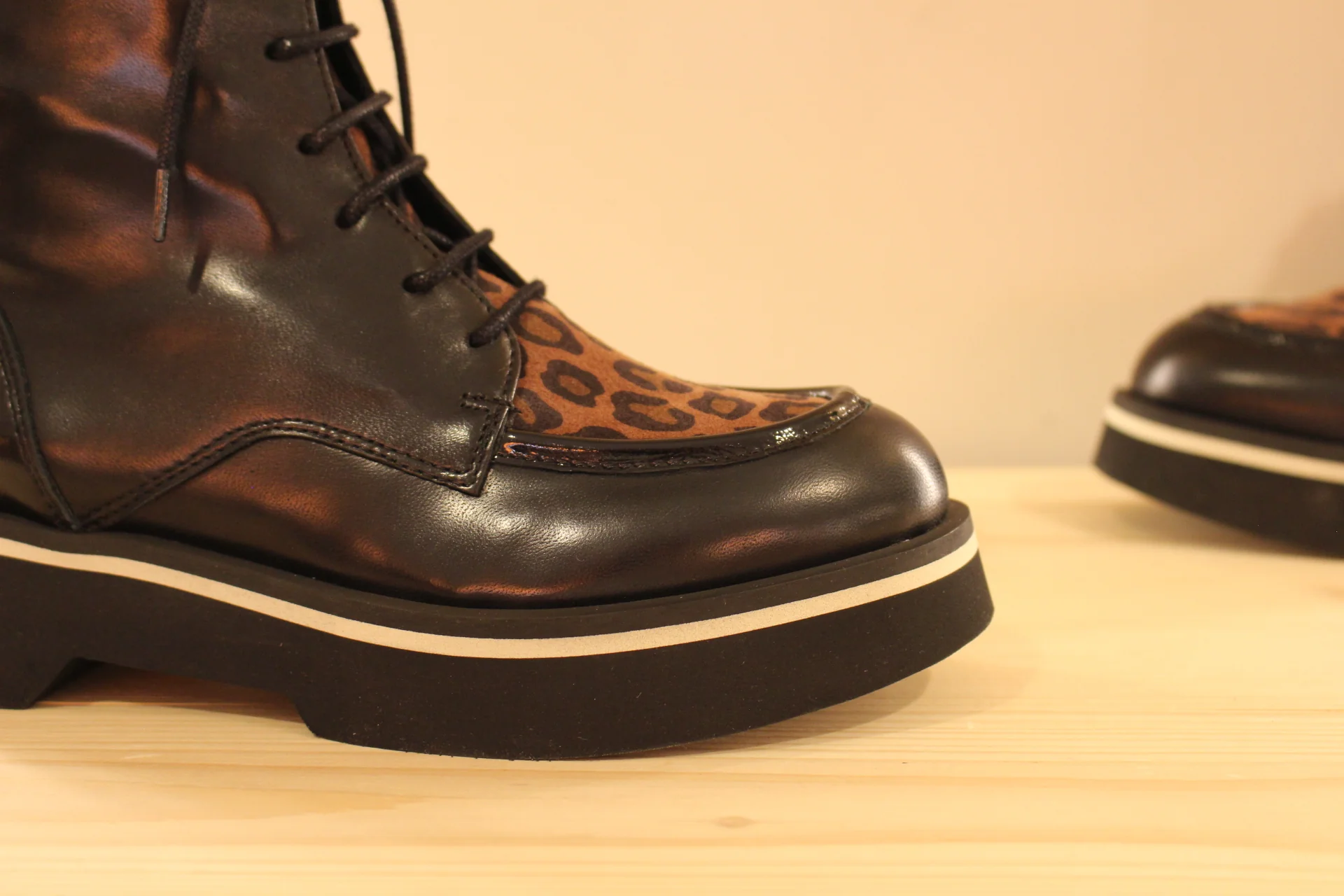 Bottines CASTA Volt. Fabrication portugaise. Bottines en cuir de couleur noir et claque sur thème animal dans les tons de camel. Serrage lacets coton noir. Zip du côté interne. Bottines de 16 cm. Chaussures doublées cuir et semelle interne amovible. Semelle externe en gomme extra légère et amortissante de 4.5 cm. Talon de 1.5 cm. Une bottine très lookée et très légère !