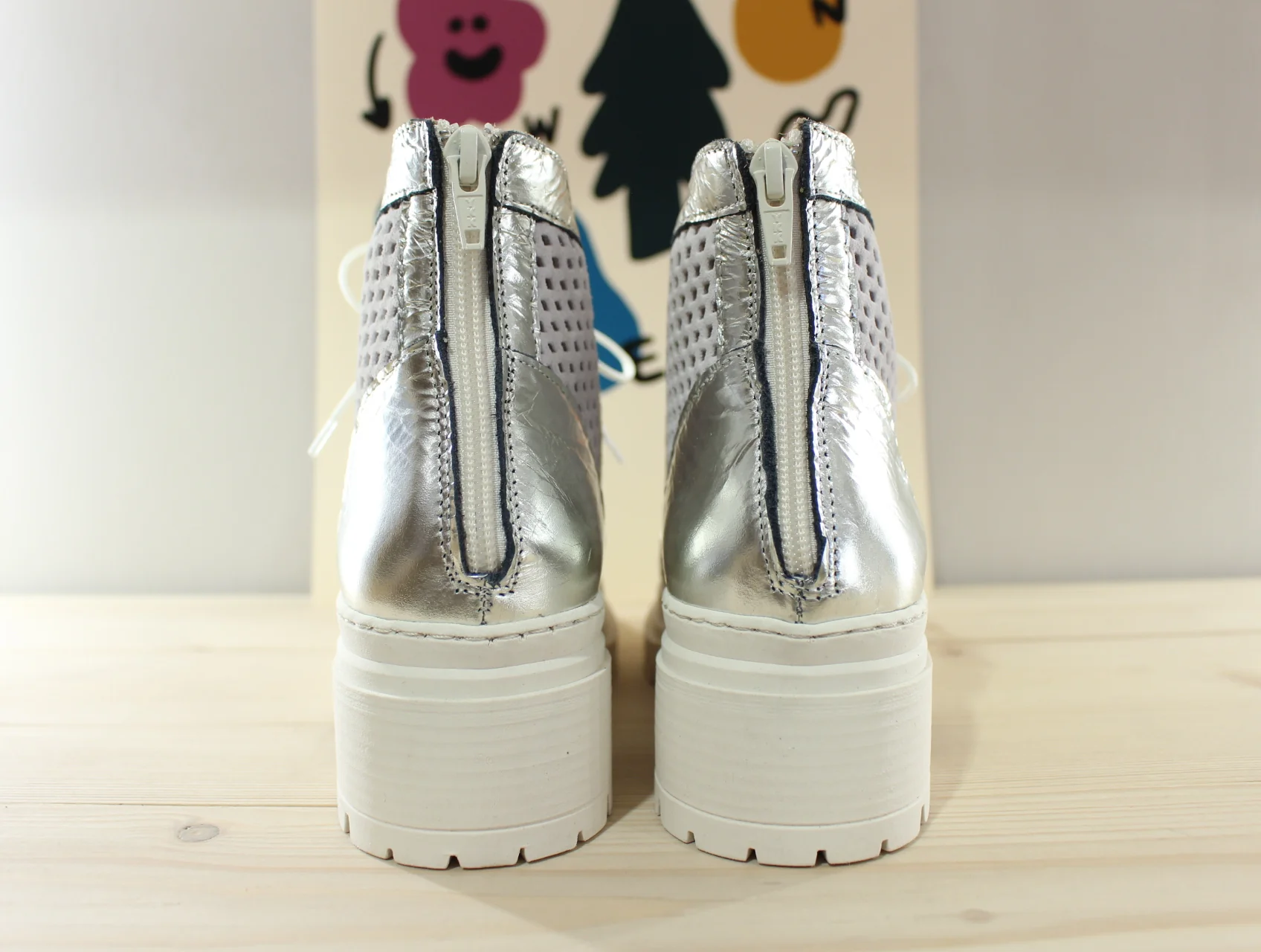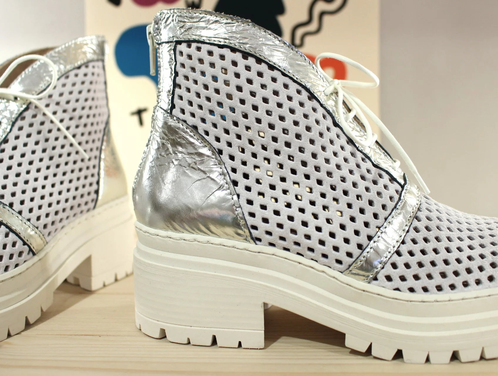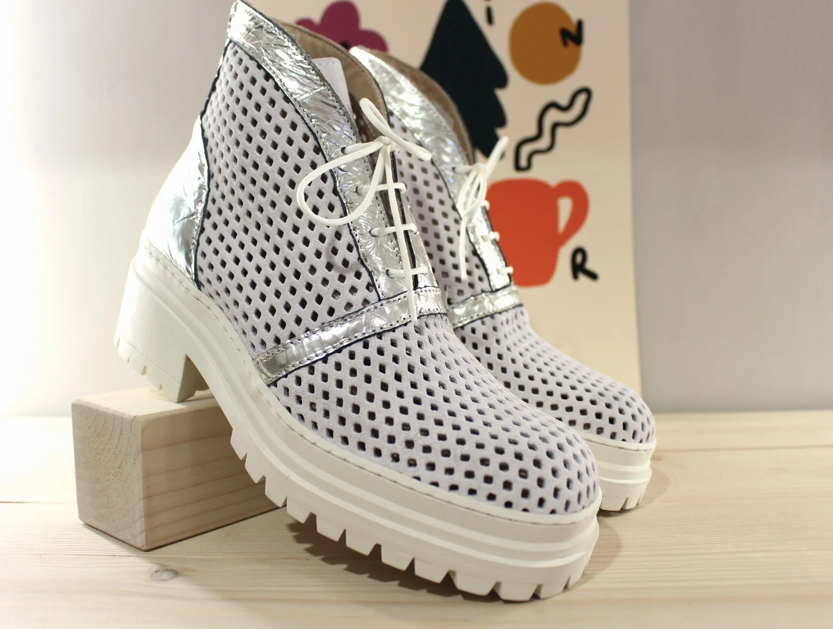 Chaussures CASTA – Zuma. Fabrication portugaise. Bottines en cuir nubuck de couleur blanc et métallisé acier. Serrage lacets en coton blanc. Zip à l’arrière. Cuir perforé. Chaussures doublées cuir. Semelle interne amovible. Hauteur de la tige de 11 cm. Semelle externe en gomme crantée de 3 cm. Talon de 2.5 cm. Existe du 36 au 41.