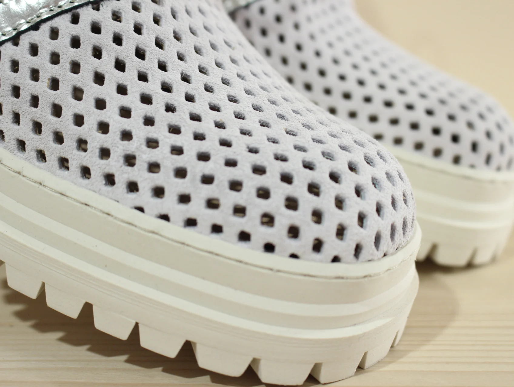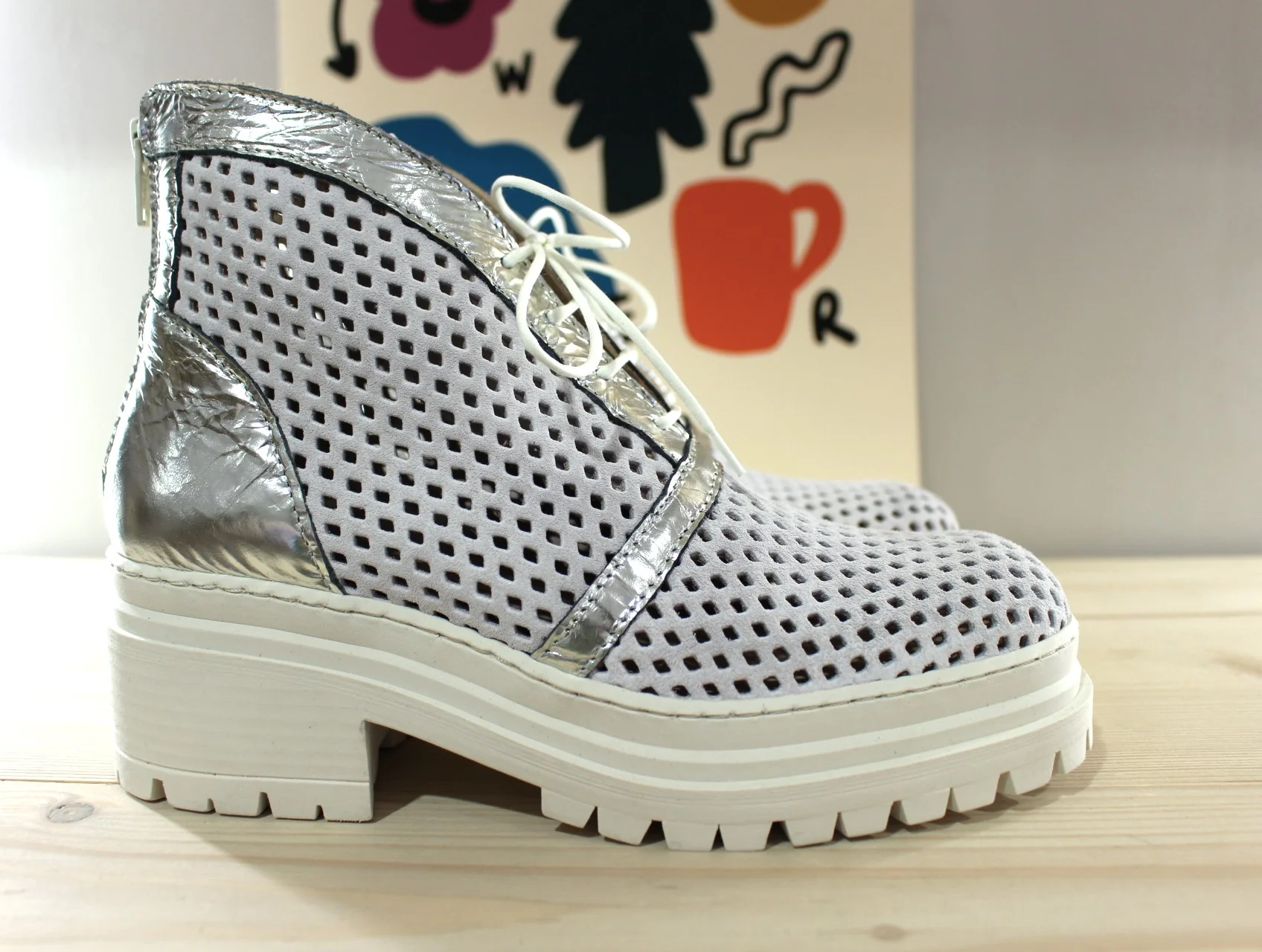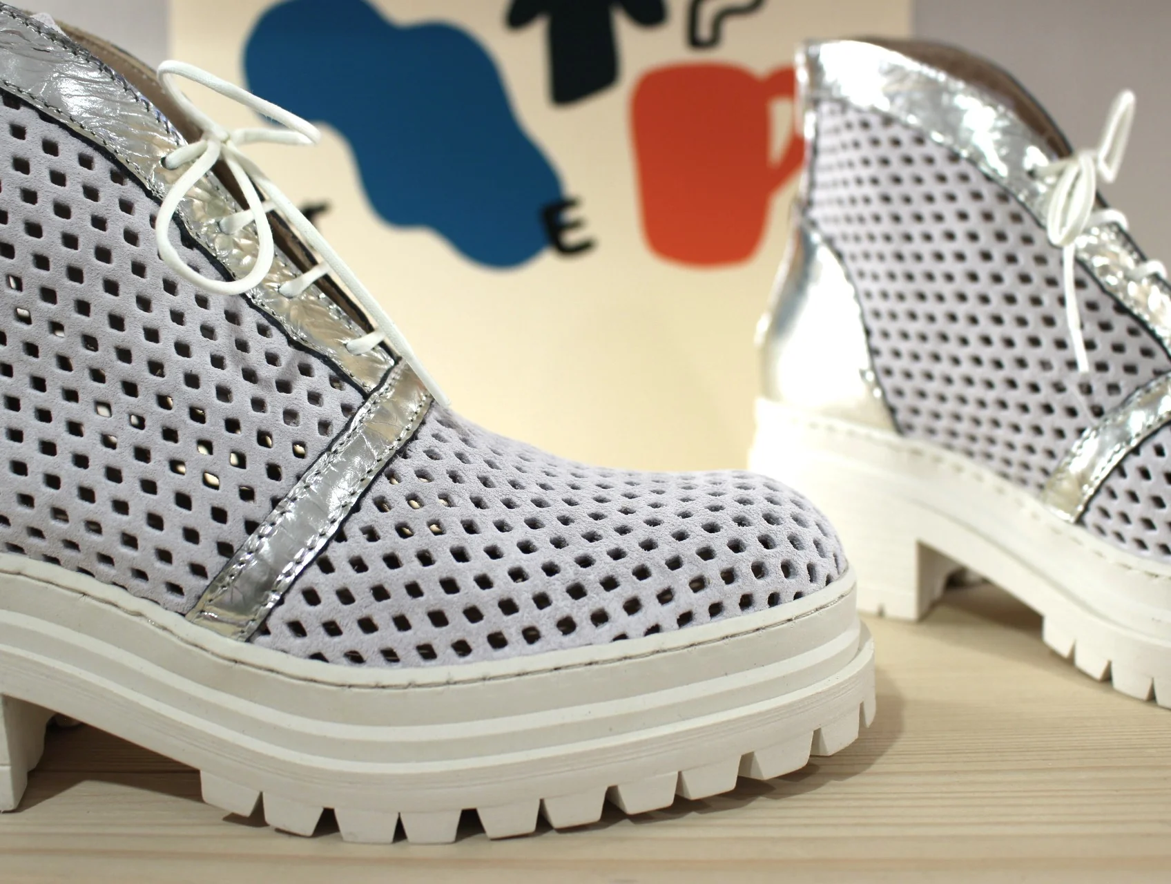 Chaussures CASTA – Zuma. Fabrication portugaise. Bottines en cuir nubuck de couleur blanc et métallisé acier. Serrage lacets en coton blanc. Zip à l’arrière. Cuir perforé. Chaussures doublées cuir. Semelle interne amovible. Hauteur de la tige de 11 cm. Semelle externe en gomme crantée de 3 cm. Talon de 2.5 cm. Existe du 36 au 41.